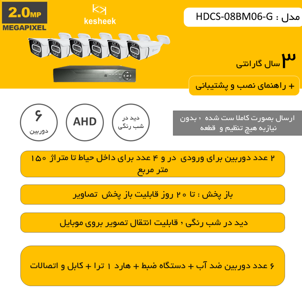 | اقلام سیستم | ۶ دوربین/دستگاه ضبط/هارد/۲۰۰ متر کابل و فیش/آداپتور |